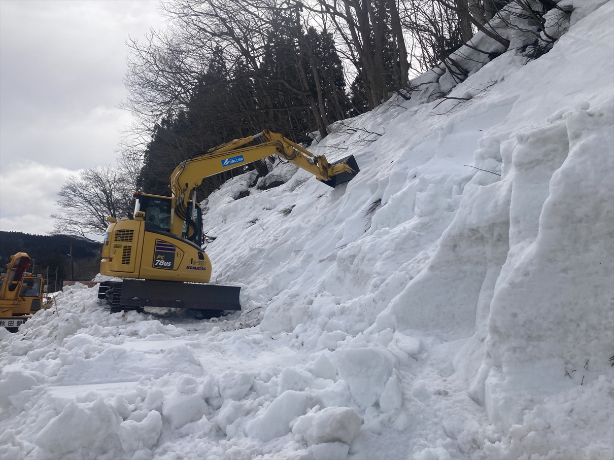 県道40号線の一部で排雪作業を行っております。雪崩の恐れがある箇所の雪を重機で崩し、ロータリー除雪機で大型ダンプに積込みしています。片側通行規制をしており道路利用者の皆様にはご迷惑をお掛けしますが、ご協力の程よろしくお願いします。